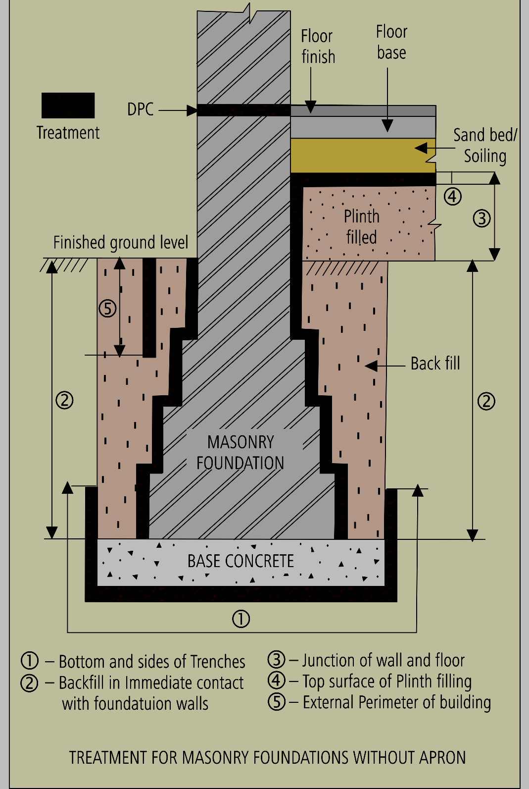 The procedure of treatment, the chemical used and the dosage shall be mentioned for the masonry structure. Treatment need not be started from the bottom of the excavation pit